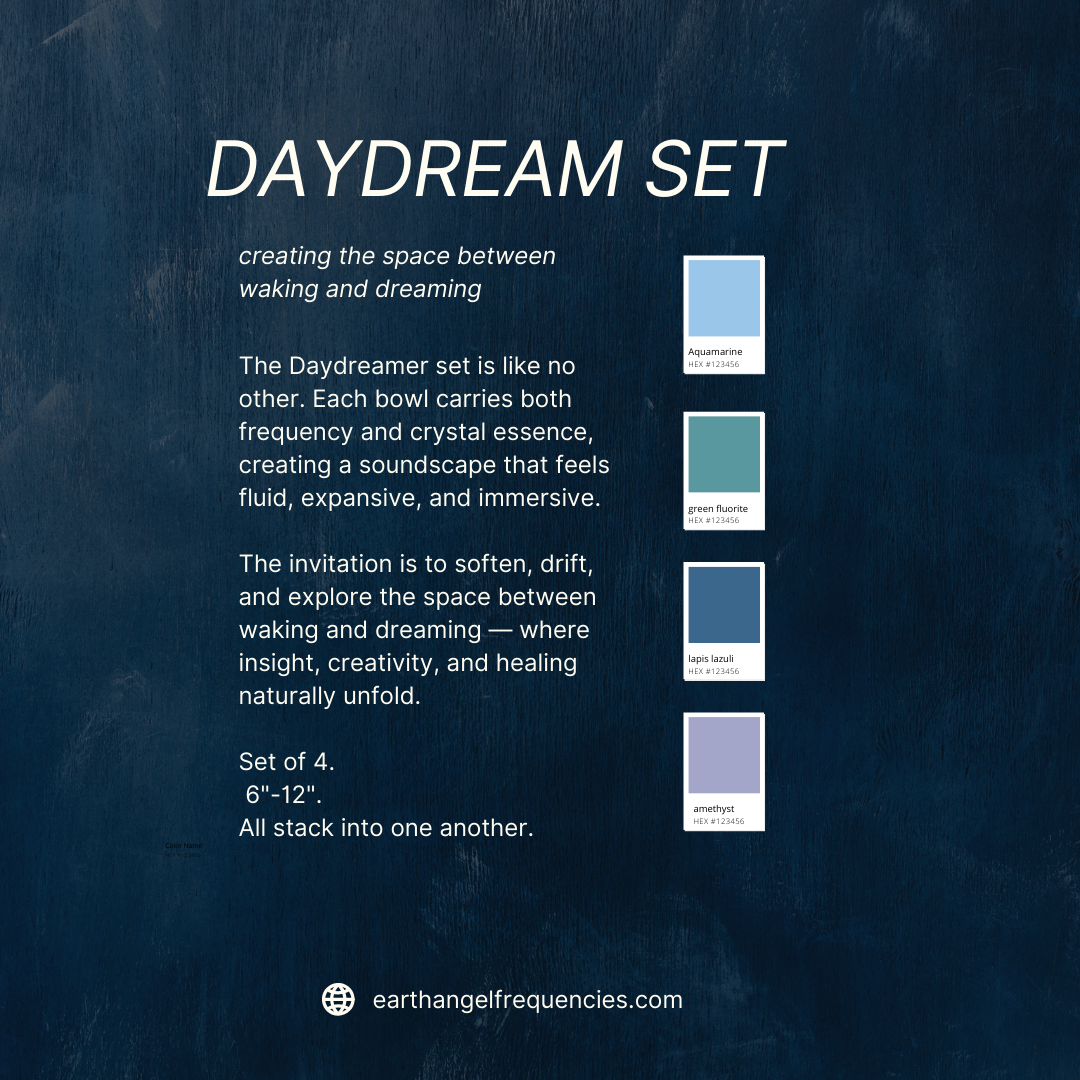 The Daydreamer Set is a high-frequency crystal singing bowl collection designed to lift awareness, quiet mental noise, and open the gateway between imagination and presence. Created for dreamers, creatives, meditators, and seekers of expanded consciousness, this set supports clarity, intuition, and gentle activation without overwhelm. Each bowl in the Daydreamer Set produces a bright, clear tone that cuts through mental clutter, allowing the mind to soften into a spacious, receptive state where insight and creativity naturally emerge.